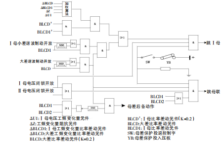 慣例比率差動元件和工頻改變量比率差動元件在母線槽差動保護中經常選用。慣例比率差動元件與工頻改變量比率差動元件一起組成快速差動保護,這在一定程度上提高了保護抗過渡電阻才能,一起,受故障前體系功角關系的影響,保護功能也有所下降。其動作判據為