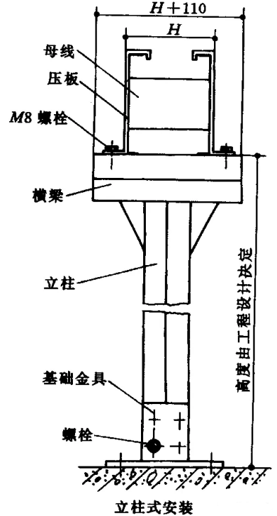 4.4封閉式母線的落地安裝(圖6)。安裝高度應按設計要求,設計無要求時應符合規范要求。立柱可采用鋼管或型鋼制作。