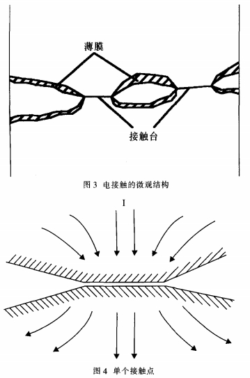 要知道在母線槽聯(lián)接處的電阻,除了母線槽自身存在的電阻外,還存在一個接觸電阻。這是因為:不管母線槽表面處理得怎樣光滑平坦,在微觀環(huán)境下,母線槽表面也是凹凸不平的,如圖3所示,兩片母線槽之間的搭接實踐上只要母線槽表面上許多小尖峰之間的接觸,電流流過搭接面的實踐面積減少了,電流線發(fā)生嚴峻的縮短現(xiàn)象,發(fā)生縮短電阻R,取其中一點剖析其結構如圖4所示。另一方面,母線槽從加工結束到裝在開關柜里有必定的時間差,很簡單因為暴露在空氣里而構成一層薄膜(如氧化膜等),使電阻增大,稱為膜電阻R,。所以接觸電阻實踐上是由這兩部分組成,即