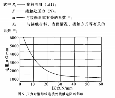 由公式(2)可知,影響母線槽搭接面接觸電阻的主要因素有表面的條件K、m和所施加的壓力F。當母線槽表面處理和接觸面積確認了,則Kj、m也確認了,于是接觸電阻Rj與壓力F成為反比聯(lián)系,壓力F越大,接觸電阻Rj越小。圖5是壓力對兩片銅導體聯(lián)接處接觸電阻的影響曲線圖。