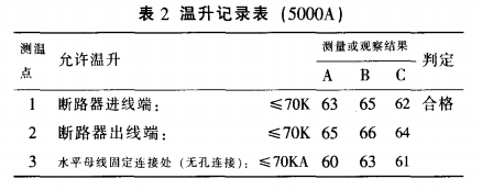 表2是溫升實驗室的質檢人員按照國家規(guī)范GB7251.1-1997的有關條款對該樣柜進行溫升實驗,對整個母線槽系統(tǒng)的關鍵處和搭接面進行丈量(測得部分溫升記載)