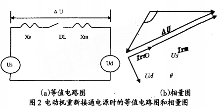 圖1所示為母線槽體系的某一段接線圖,圖2為電動機切換時的等值電路圖。圖中Us-電源電壓;Ud-母線槽上電動機的殘壓;Xs-電源等值電抗;Xm-母線槽上電動機組和低壓負載的等值電抗(折算到高壓母線槽壓);AU-電源電壓與殘壓之間的差拍電壓。