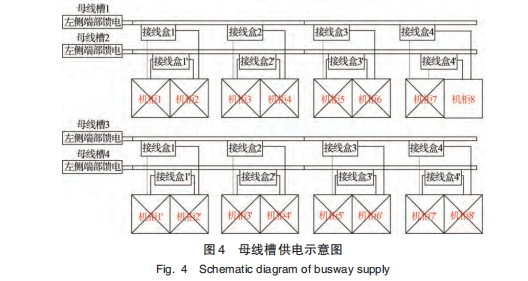 端部饋電模塊由每一列機(jī)柜對(duì)應(yīng)的主備供母線槽各配備1個(gè)接入配電盒,與主干母線槽的插接箱間選用電纜聯(lián)接。