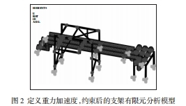3載荷,綁縛的仿照定義重力加速度9800mm/s2,在支架立柱底端及其他相應(yīng)方位施加綁縛。如圖2所示,為定義重力加速度,綁縛后的ANSYS仿真圖。