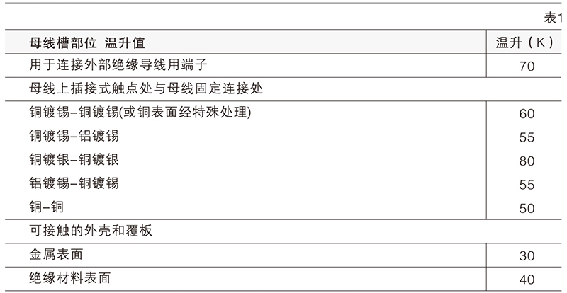母線槽各部位溫升不應超出表1規定,特殊情況下在不影響絕緣材料的絕緣性能和使用壽命時,可適當提高溫升。